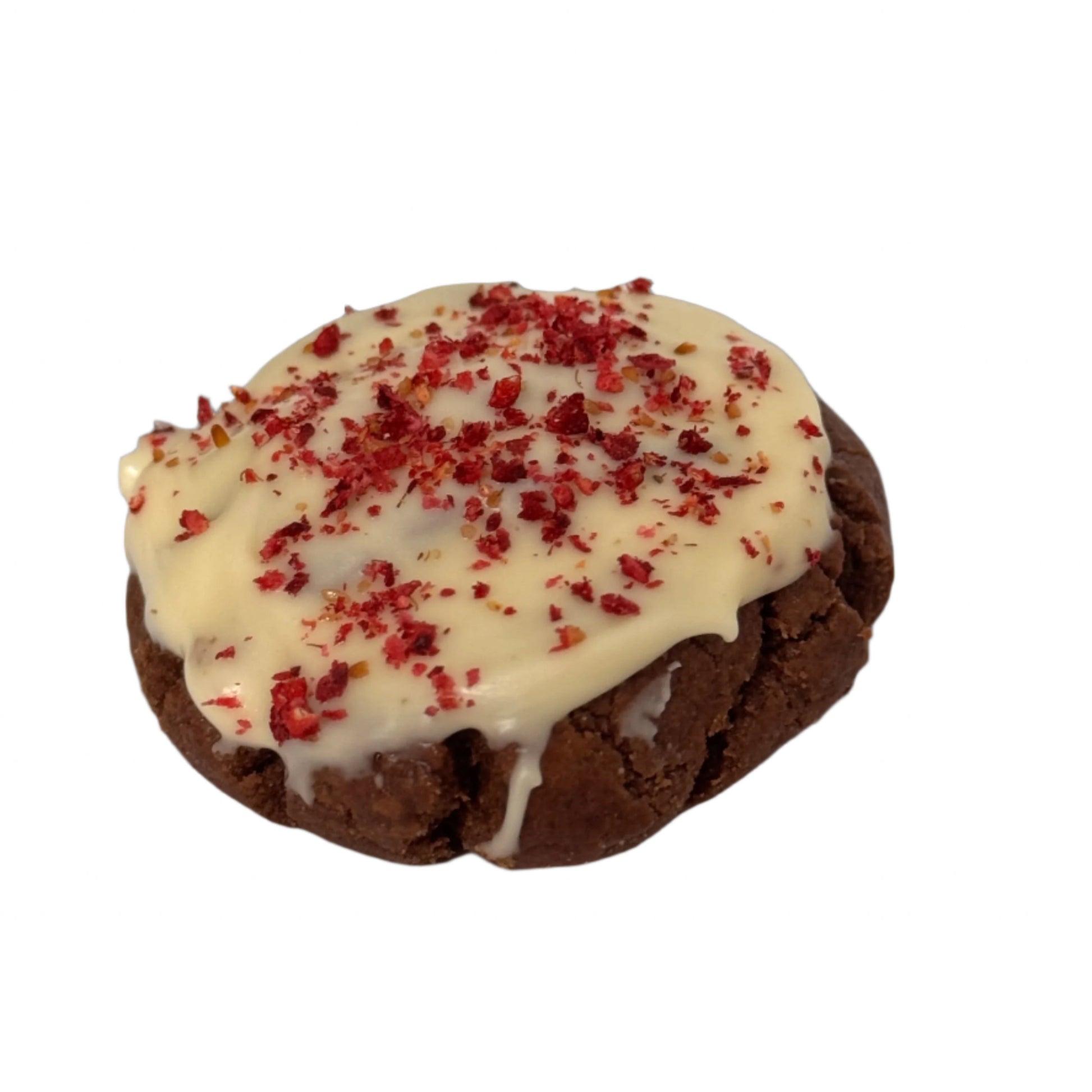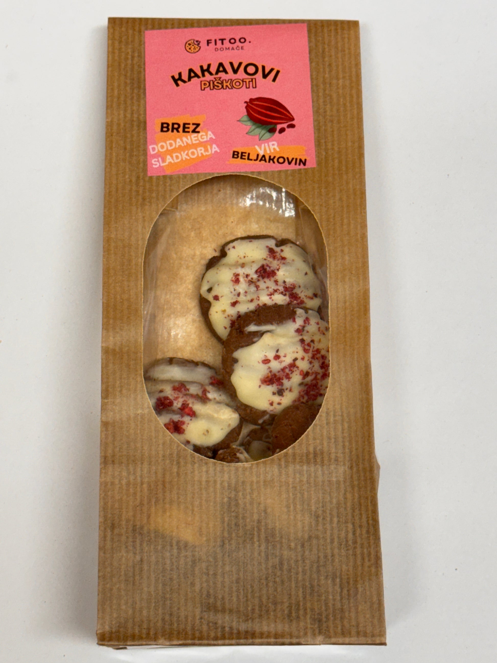 Domači pirini kakavovi piškoti z belo čokolado in malino, s sladilom in dodanimi proteini, brez dodanega sladkorja, vsebuje naravno prisotne sladkorje.