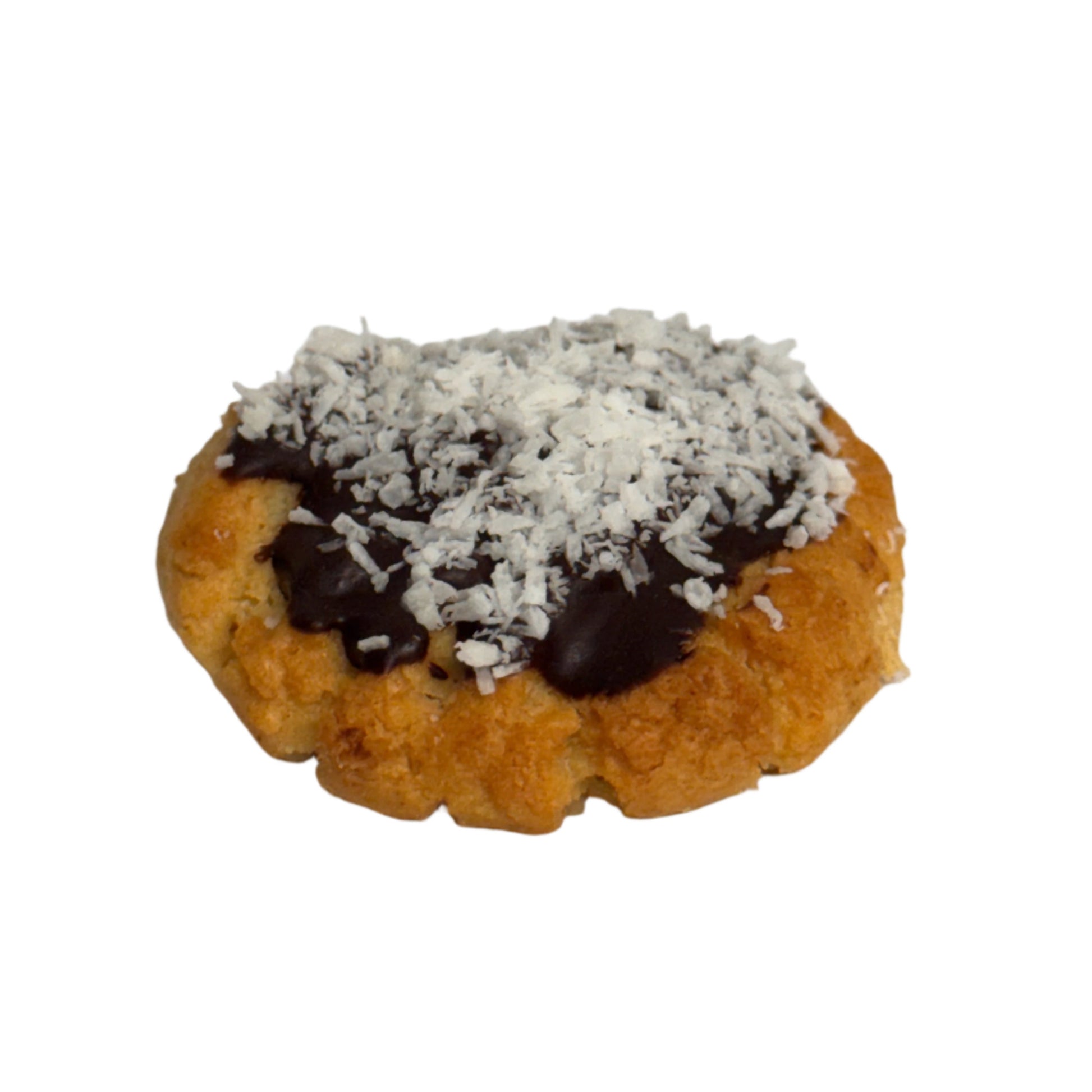 Domači pirini kokosovi piškoti s temno čokolado s sladilom in dodanimi proteini, brez dodanega sladkorja, vsebuje naravno prisotne sladkorje. Sestavine: