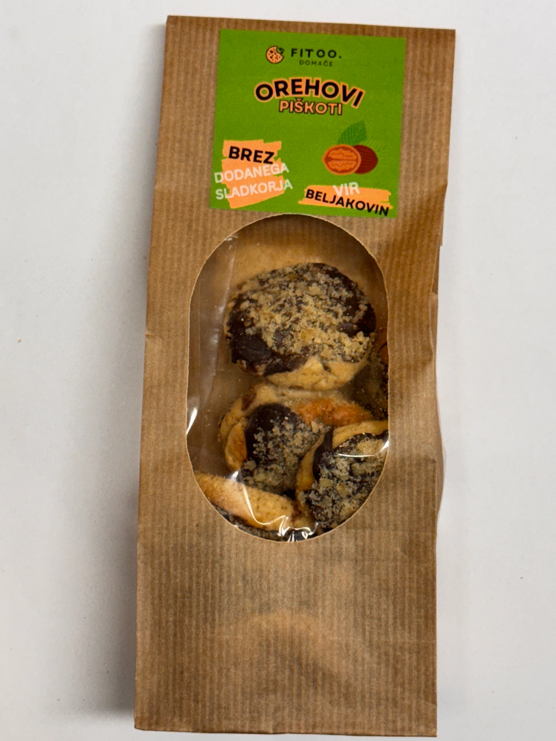 Sestavine: PŠENIČNA (pirina) moka (35%), MASLO, mleti OREHI (18%), izdelek izdelan iz MLEČNIH beljakovin v prahu (8,7%) (koncentrat sirotkinih beljakovin, emulgator: lecitini (SOJA), aroma, sladilo: sukraloza), sladilo: ksilitol, polno MLEKO, temna čokolada (1,05%) (kakavova masa, sladiloi eritrol, steviol glikozidi, kakavovo maslo, inulin, manj masten kakav v prahu, emulgator: lecitini (sončnični), naravna aroma vanilije), pecilni prašek (kislina: difosfati, sredstvo za vzhajanje: natrijev hidrogenkarbonat, koruzni škrob), jodirana sol.